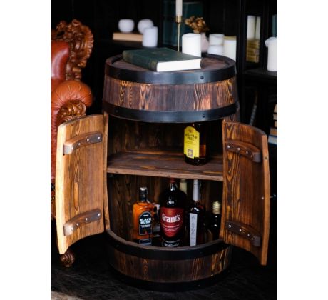 Štýlový minibar vyrobený z borovicového dreva v tvare suda. Takýto bar je praktickým doplnkom do domácnosti alebo firmy.